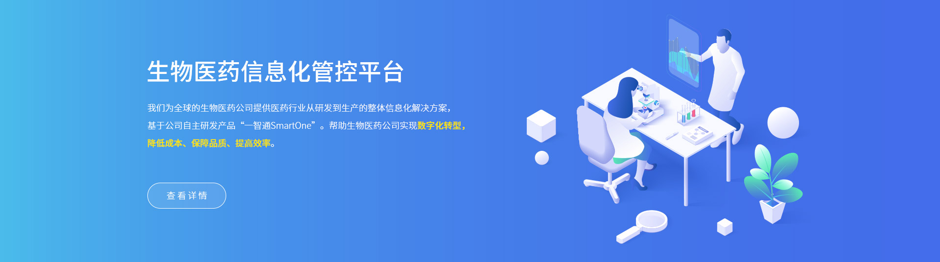 我們?yōu)槿虻纳镝t(yī)藥公司提供醫(yī)藥行業(yè)從研發(fā)到生產的整體信息化解決方案,基于公司自主研發(fā)產品“一智通SmartOne”。幫助生物醫(yī)藥公司實現(xiàn)數(shù)字化轉型,降低成本、保障品質、提高效率。