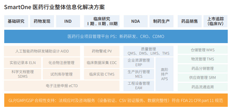 我們?yōu)槿虻纳镝t(yī)藥公司提供醫(yī)藥行業(yè)從研發(fā)到生產的整體信息化解決方案,基于公司自主研發(fā)產品“一智通SmartOne”。幫助生物醫(yī)藥公司實現(xiàn)數(shù)字化轉型,降低成本、保障品質、提高效率。